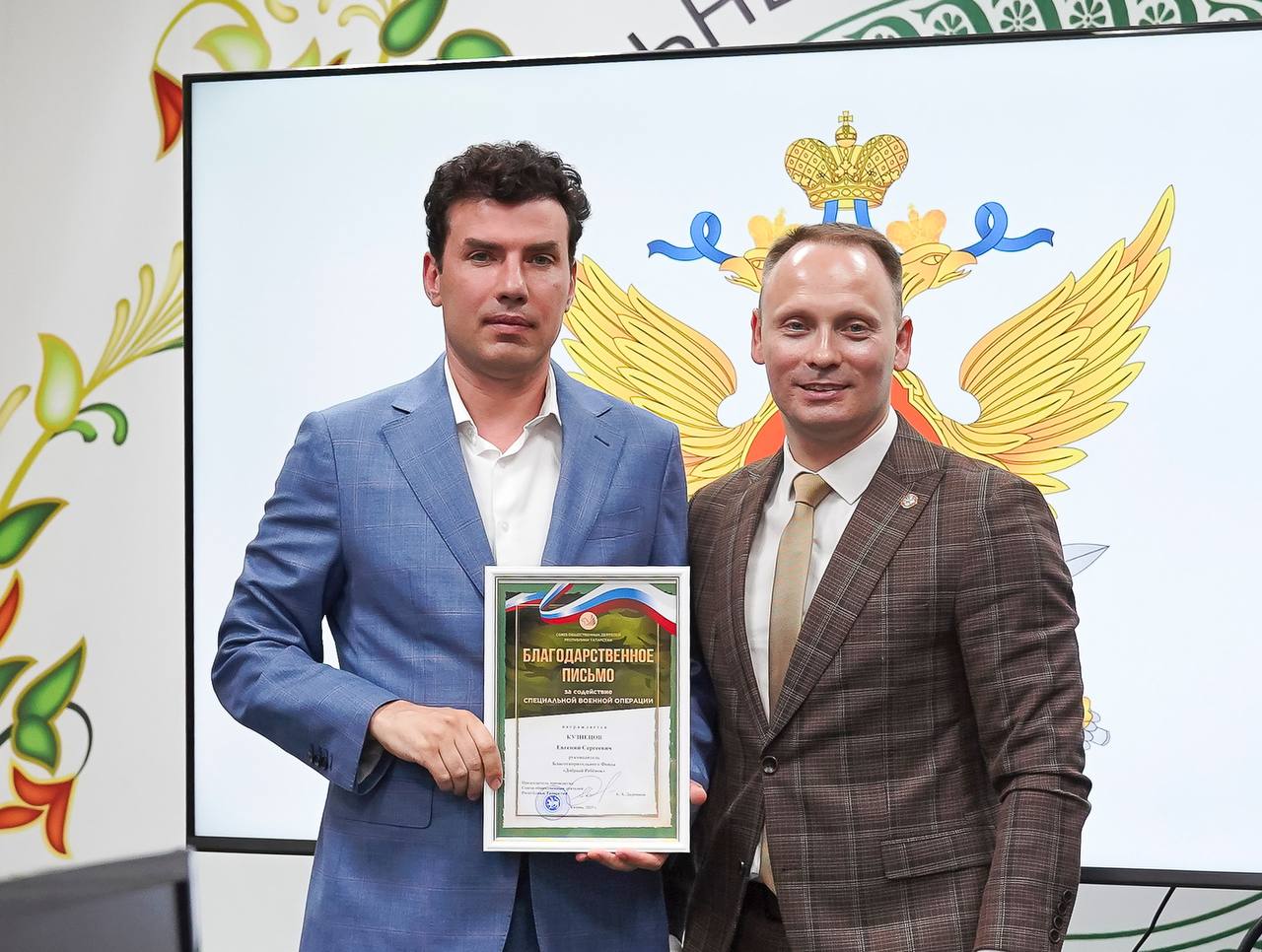 Заседание завершилось церемонией награждения. Руководителю фонда Евгению Кузнецову было вручено Благодарственное письмо за содействие СВО.